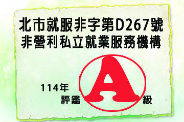 非營利私立就服機構許可證 北市就服非字第0267號 北市就服非字第0267號 非營利私立就服機構114年評鑑A級 非營利私立就服機構114年評鑑A級 收費項目及金額明細表 收費項目及金額明細表 收費項目及金額明細表 就業服務專業人員證書字號 就專字第06789號 就專字第06789號 就專字第06874號 就專字第06874號 就專字第06882號 就專字第06882號 就專字第06966號 就專字第06966號 就專字第07162號 就專字第07162號 就專字第09757號 就專字第09757號 相關連結 求職防騙宣導 職場平等宣導 違反勞動法令公布專區 簽訂職業介紹服務定型化契約注意事項