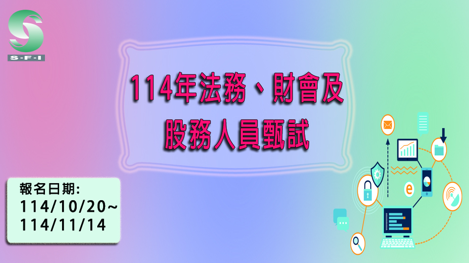 證基會股東會議案研究業務新進人員招募 114年中華民國證券暨期貨市場發展基金會股東會議案研究業務新進人員招募,自114年10月20日(一)10:00至114年11月14日(五)17:00止開放報名,一律採網路線上報名,不接受通信及現場報名,為免網路壅塞,請儘早上網報名 招募類別 法務人員-副研究員 需求人數 1 學歷、資格條件及第一階段(筆試)測驗科目 連結下載說明 招募類別 財會人員-副研究員 需求人數 1 學歷、資格條件及第一階段(筆試)測驗科目 連結下載說明 招募類別 財會人員-助理研究員 需求人數 2 學歷、資格條件及第一階段(筆試)測驗科目 連結下載說明 招募類別 股務人員-副研究員 需求人數 1 學歷、資格條件及第一階段(筆試)測驗科目 連結下載說明 招募類別 股務人員-助理研究員 需求人數 1 學歷、資格條件及第一階段(筆試)測驗科目 連結下載說明 招募類別 需求人數 學歷、資格條件及第一階段(筆試)測驗科目 法務人員-副研究員 1 下載說明 財會人員-副研究員 1 下載說明 財會人員-助理研究員 2 下載說明 股務人員-副研究員 1 下載說明 股務人員-助理研究員 1 下載說明 相關測驗訊息,請參考中華民國證券暨期貨市場發展基金會「股東會議案研究業務招募說明」或電洽服務電話:(02)2397-1222轉分機358陳小姐、350林先生、317李小姐。 招募說明 前往報名