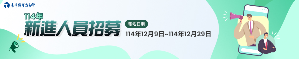臺灣期貨交易所新進人員招募,自114年12月9日(二) 10:00至114年12月29日(一) 17:00止開放報名,一律採網路線上報名,不接受通信及現場報名,為免網路壅塞,請儘早上網報名。